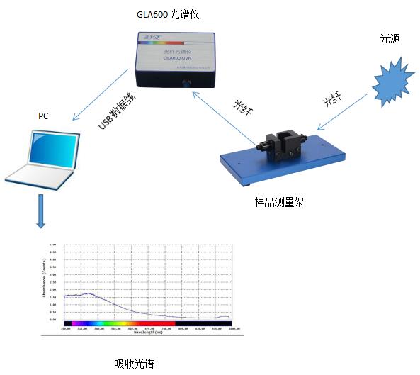 吸收率是指投射到物体上而被吸收的热辐射能与投射到物体上的总热辐射能之比称为该物体的吸收率。物体表面吸收率的与物体的性质、表面状况和温度等因素有关,是物体本身的固有特性,与外界环境情况无关。用GLA600光纤光谱仪测量物体的吸收率,首先用光纤连接光源和样品测量架的一端,另一端连接GLA600光纤光谱仪,GLA600光纤光谱仪连接PC,在软件中勾选吸收率测量模式,打开光源,采集原始光谱(总辐射能),然后在测量架中放入测量样品,采集透过光谱(透过物体的光辐射能量),经过软件的运算得到被测样品的吸收率。吸收率测量图示如下: