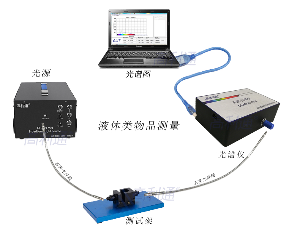 上述液体透射光谱测量图是由光源发出的光通过石英光纤照射在样品上,透过样品的光再经光纤传输至光纤光谱仪,实现光电转换以光谱形态呈现。本测量图中,光源可以实现氘卤光源与LED光源的切换,满足不同的实验需求。