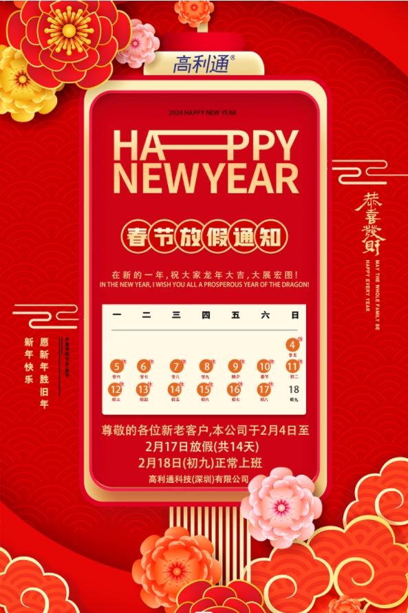 我司于2024年2月4日(腊月廿五)-2月17日(正月初八)放假,共14天。2月18日(初九)正式上班。放假期间工作处理不及时之处敬请谅解!