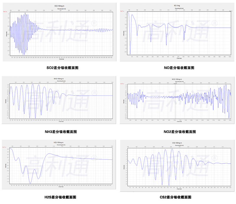 所测各种污染气体如二氧化硫、一氧化氮、二氧化氮、氨气、臭氧、甲醛、一三丁二烯、硫化氢等在紫外波段具有特征吸收谱。恒定流量抽取待检测的气体经过气室,氘灯(或氙灯)发出的紫外光经过气室后,被气体中的有关组分吸收。由光纤光谱仪获取被吸收后的紫外光谱,分析气体的特征吸收峰,反演出气体中所含的被测气体组分浓度,结合烟道中的压力、温度、湿度等参数,计算各气体的排放量。