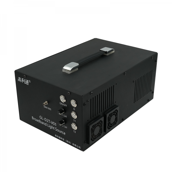 • bw必威西汉姆联生产的GL-D2T-V01一体化复合宽带氘钨灯,可提供200nm至2500nm (决定于所用的滤光片)紫外-可见-近红外光高效稳定的连续输出光谱。为了获得相对均匀、平滑和近红外光增强的宽带光谱,采用将单氘灯和双钨灯三光合一的组合产生宽带光谱,其中单氘灯产生紫外、第一钨灯产生可见光和部分近红外光、第二钨灯产生增强近红外光。将此三种光利用同一个SMA905光纤接头输出,便可获得均衡连续平滑而且近红外光增强的宽带光谱。 与探测器为CCD或CMOS的光谱仪配合使用,GL-D2T-V01 氘钨灯可在避免CCD或CMOS探测器饱和的前提下进行大动态范围的宽带光谱分析,并能有效地提高近红光波段的信噪比。两个钨灯的光谱输出强度可以用旋钮调节,氘灯的光谱输出强度可以用相应的滤光片调节。